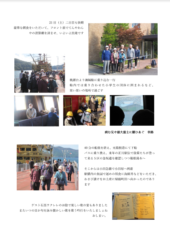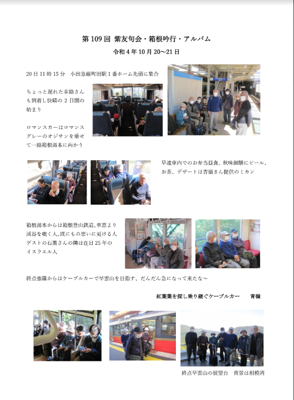 第109回紫友句会まとめ(箱根吟行)石井 力2022年10月30日読了時間: 1分10月20日、21日に催された箱根吟行のまとめをお送りいたします。本当に天気に恵まれた、美しい青い空の下の吟行でした。俳句まとめのほかに、斗升さんのご苦労の写真集が添付されています。良い記念になりますね。 吟行の箱根より寒いくらいの夜が訪れるようになってきました。どうぞお大事にお過ごしくださいませ。 青嶺