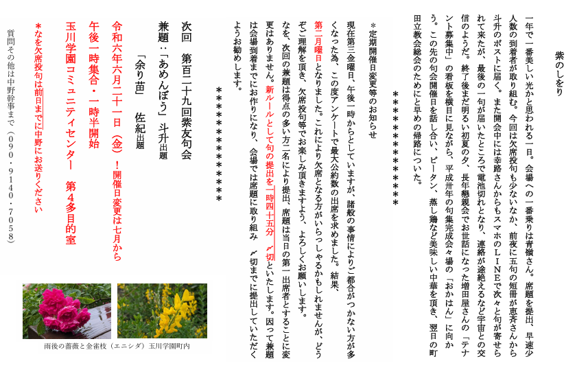 今回は、句会開催日を改めて検討し、7月以降は第二月曜日とすることになりました。経緯の詳細は、句会まとめをご確認ください。皆さまそれぞれのご都合によります。どうぞよろしくお願い申し上げます。