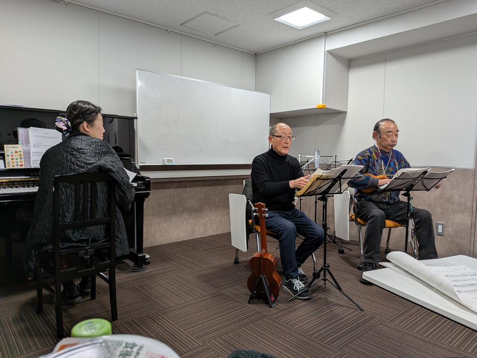 ピアノと2台のウクレレによる伴奏。カラオケでは味わえない良さがあります。